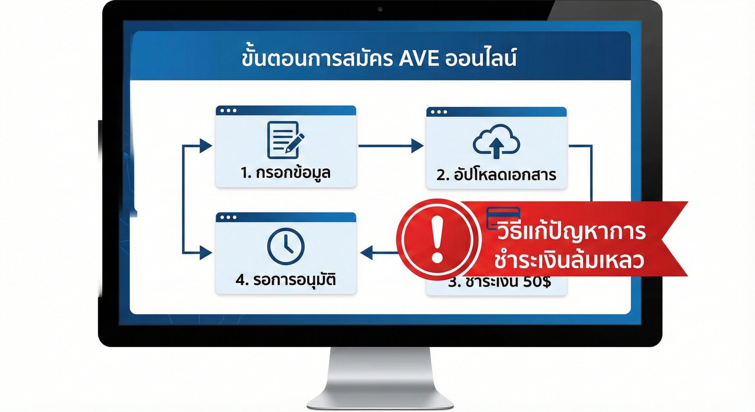 '2. 上传文件' -> '3. 支付50$' -> '4. 等待批准'。在'支付50$'步骤,用一个醒目的红色感叹号和'Payment Failed Solution'的文字,呼应文章中支付失败的痛点,强调实操指导。色彩上使用科技蓝和白色,突出线上操作的专业感。”>