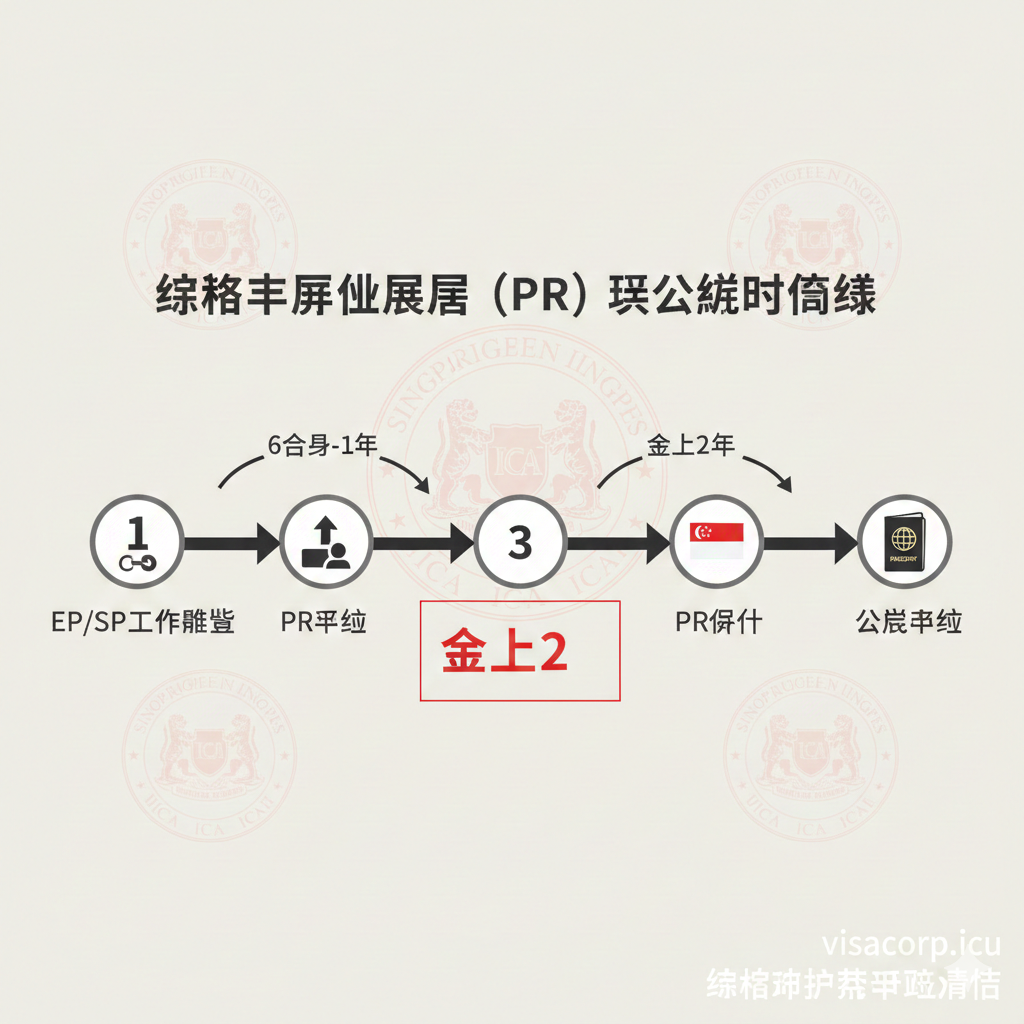 'PR申请' -> 'PR身份(至少2年)' -> '公民申请'这几个关键节点。每个节点旁配有数字和关键时长(如:6个月-1年、至少2年)。背景是米白色或浅灰色,使用新加坡移民与关卡局(ICA)的红色印章或图标作为点缀,营造官方、精确的教程感。构图简洁、信息密度高,重点突出'至少2年'的PR等待期。”>